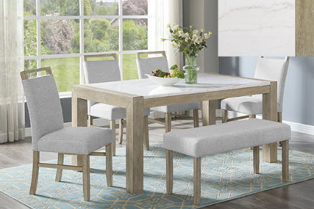 This dining set offers a clean, modern look with its sleek lines and neutral tones. The sturdy table with a genuine marble top is both stylish and timeless, paired with comfortable chairs and a matching bench that provide ample seating for family and friends. Its simplicity in design makes it versatile for a variety of dining room decors, while the compact size ensures it fits well in smaller spaces. Perfect for everyday meals and casual entertaining, this set delivers functionality and straightforward style.