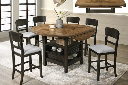 Elevate your dining experience with our contemporary dining ensemble. Infused with a modern twist on classic design, this set effortlessly balances sophistication with functionality. Featuring a rich two-toned wood finish complemented by sleek, dark chairs. Four drop leaves to expand the size, a built in turntable, and storage efficiency, it promises to be a delightful and practical centerpiece for all your memorable gatherings.