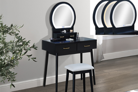 Create a chic and functional centerpiece for your bedroom or dressing area with this elegant vanity set. The sleek, black finish exudes modern sophistication, while the gold-accented handles add a touch of luxury. The built-in LED-lit mirror provides optimal lighting for flawless makeup application or grooming, creating a glamorous and practical space. With spacious drawers and an upper shelf, it offers ample storage to keep your beauty essentials organized and within easy reach. The matching cushioned stool ensures comfort and style, perfectly complementing the overall design. This set combines functionality with aesthetic appeal, making it the ultimate addition to any stylish home.