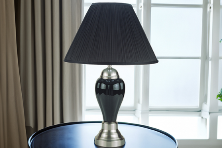 Illuminate your space with this elegantly crafted table lamp. Featuring a glossy black base and contrasting metallic details, it's perfect for a modern look. The broad, pleated shade offers a diffused light ideal for any setting.