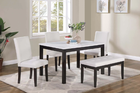 This 5-piece dining set's versatile design ensures it looks right at home in open dining areas, kitchens, or even a small formal space. At the center is a rectangular dining table, crafted with a striking faux marble top that lends an elegant, polished look without overwhelming your space. Its two-toned finish effortlessly blends with a wide range of décor styles, from traditional to modern, making it an adaptable choice for your home. The seating includes three armless chairs and a spacious bench, giving you flexible arrangements for dining, entertaining, or casual lounging. Each chair is thoughtfully built with a supportive full back and upholstered in smooth faux leather, adding both comfort and refinement. The padded cushioning creates a cozy dining experience while the sleek upholstery enhances the set’s sophisticated aesthetic. The bench provides a stylish alternative to traditional seating, great for accommodating kids or extra guests with ease. Whether you’re enjoying a quick breakfast, hosting a dinner, or gathering with friends, this set provides a warm, inviting atmosphere for every occasion.