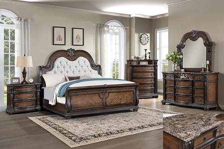 Step into a world where classic elegance meets timeless design with our exquisite bedroom collection. Designed for those who covet regal charm and functionality, this suite features rich, natural wood tones that evoke the grandeur of an aristocratic estate. Each piece boasts intricate carvings and moldings, with a stately bed that stands as the centerpiece — its tufted headboard provides a touch of luxury and comfort. The coordinating pieces, including a multi-drawer dresser, a gracefully curved mirror, and a tall chest, all offer generous storage while maintaining the sophisticated aesthetic. Marble tops and antiqued hardware add a final touch of elegance, ensuring this collection will elevate your bedroom into a luxurious retreat.